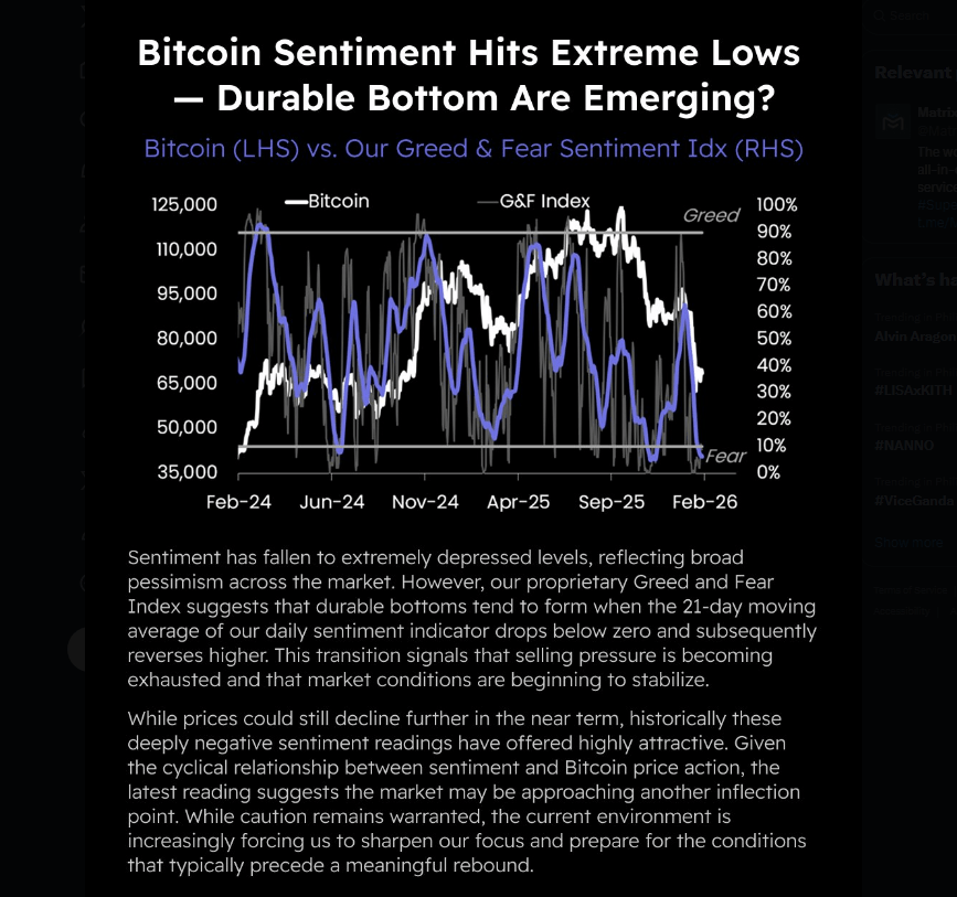 According to Matrixport, its Bitcoin fear-and-greed gauge has the 21-day moving average below zero and starting to turn up, which is the kind of shift that in prior episodes marked the end of broad selling.