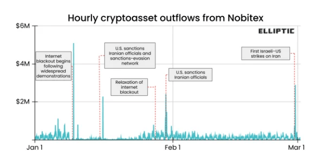 According to blockchain tracking firm Elliptic, wallets linked to Nobitex, Iran’s biggest crypto trading platform, sent out far more funds than usual within minutes of the first strike. In less than an hour, transfers climbed into the millions of dollars. The surge was quick. It was also brief.